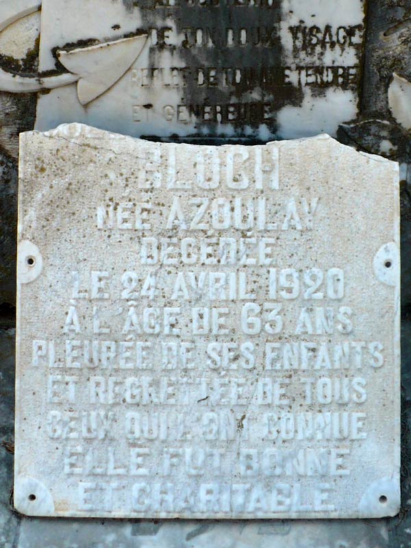 Née à Alger le 10 janvier 1857, veuve d'Emannuel Bloch. Inhumée dans le caveau de son époux Emanuel Bloch, sa plaque est posée sur la sépulture de Viva Eugénie Attias carré 01 rangée 03